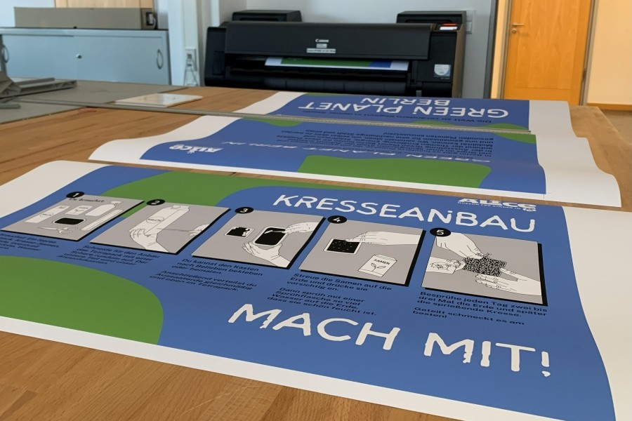 Parallel dazu gestaltete das Team der Studierenden eine Plakatserie im Eingangsbereich des Museum für das Laufpublikum im FEZ. Die Poster dienten als Countdown zur Ausstellungseröffnung, da das Museum während des Umbaus geschlossen war. Sie verbanden analoge und digitale Kommunikationsräume durch QR-Codes, Mitmachaktionen und Vorstellungen von „Klimaheld*innen“. Die Studierenden erstellten monatlich Designs und Inhalte, die sie in der Druckwerkstatt der HTW selbst druckten.
